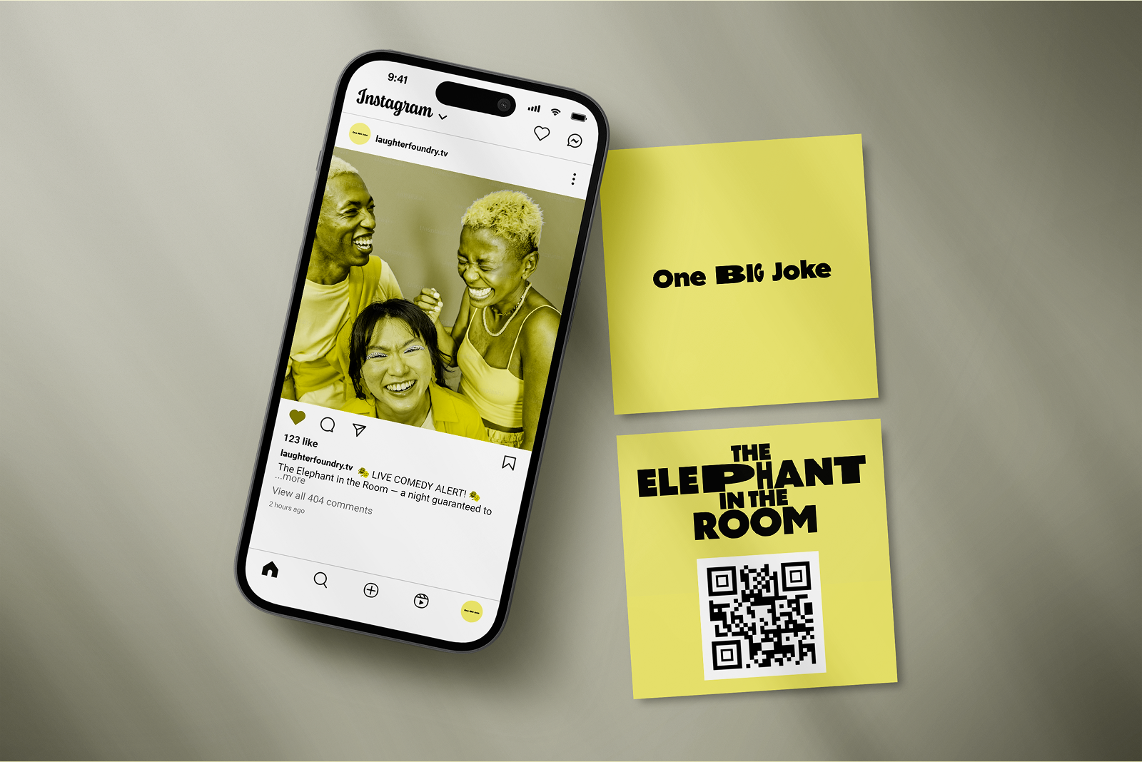 Elephant in the Room is a comedy festival across Manchester, celebrating comedians who tackle the topics we usually avoid. The visual identity uses collage, objects, and oversized type to subtly form the shape of an elephant — playful yet provocative. A bold yellow theme runs through the project, inspired by early handmade imagery, and the design easily adapts across merchandise and ads, allowing the ‘elephant’ to appear in unexpected places.